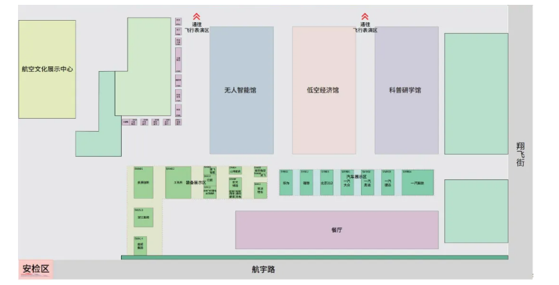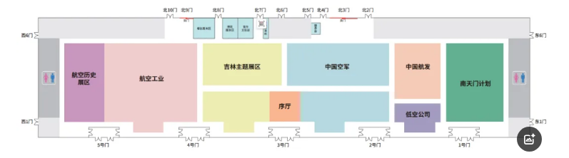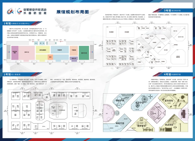 В выставочном центре размещаются павильон Военно-воздушных сил, павильон Центрального военно-промышленного комплекса и павильон аэрокосмической промышленности провинции Цзилинь. Выставка, посвященная теме «Мощное оборудование – будущее аэрокосмической отрасли», демонстрирует стратегический научно-технический потенциал страны и центр аэрокосмических инноваций, а также уникальные особенности развития провинции Цзилинь, историю и культуру авиации. В общей сложности 73 государственных предприятия, включая Корпорацию авиационной промышленности Китая, Корпорацию авиационных двигателей Китая, компанию спутников Чангуан и корпорацию химических волокон Цзилинь, а также ведущие частные предприятия провинции, представили 36 новых технологий и более 100 новых продуктов.