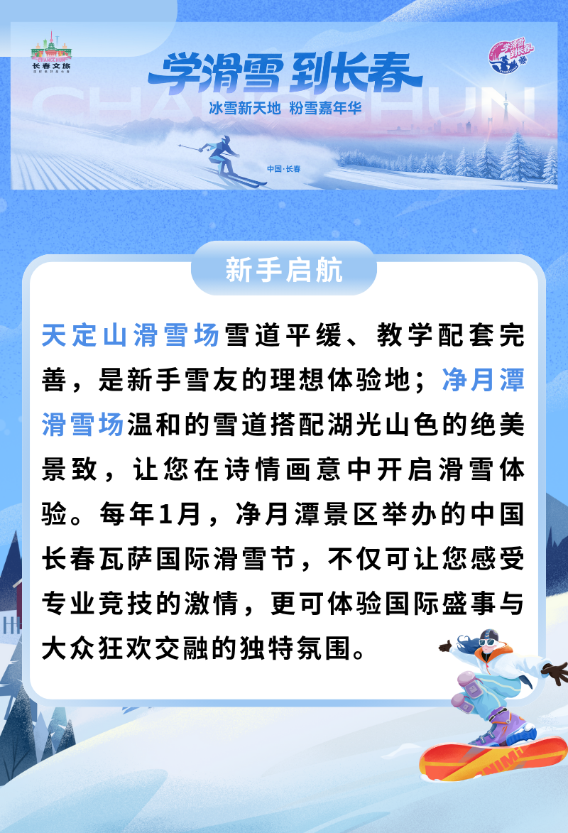 Горнолыжный курорт Тяньдиншань с его пологими склонами и хорошо налаженным учебным процессом — идеальное место для первых шагов на лыжах. Нежные трассы горнолыжного курорта Цзинъюэтань в сочетании с прекрасными видами на озеро и горы позволят вам начать катание в поэтической обстановке. Ежегодно в январе в парке Цзинъюэтань проходит Китайский Чанчуньский международный лыжный фестиваль «Васа», где вы сможете не только прочувствовать азарт профессиональных соревнований, но и окунуться в уникальную атмосферу, где смешиваются международное событие и народное гуляние.