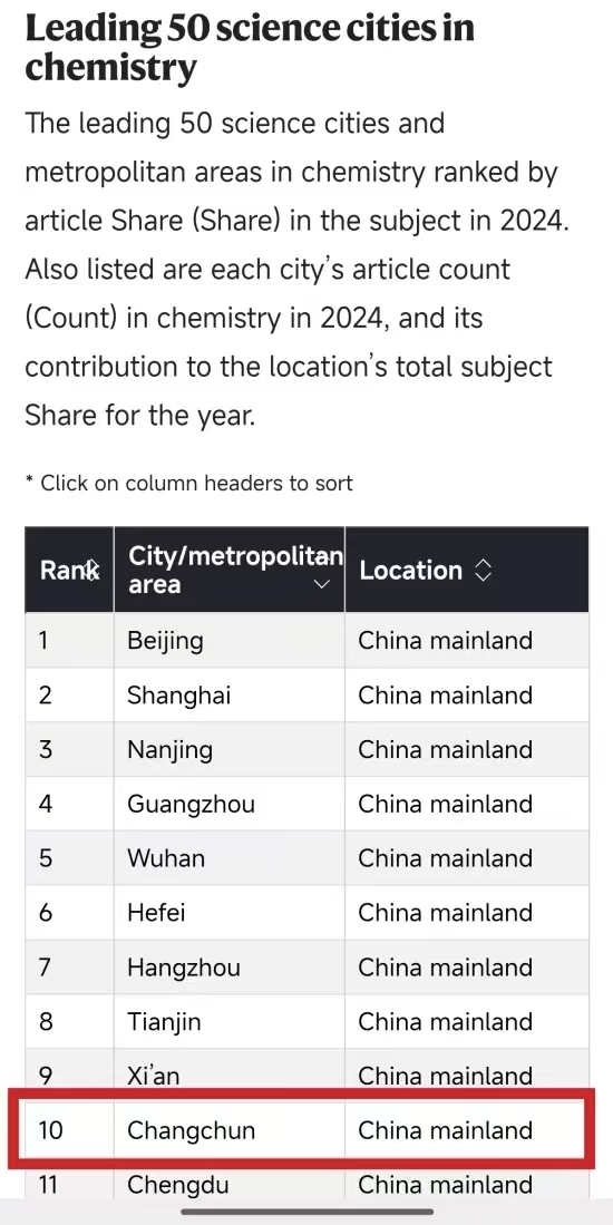 Рейтинг анализирует научные результаты городов по пяти основным дисциплинам: химия, физика, науки о Земле и окружающей среде, биология и науки о здоровье. Чанчунь занял 10-е место в Китае по химии! Эти объективные данные подтверждают статус города как важного научного центра Северо-Восточного Китая с мощным потенциалом и динамичным развитием.