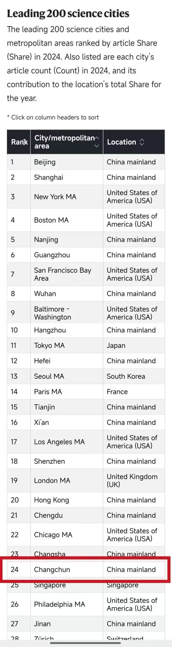 16 ноября издательство Springer Nature выпустило онлайн-приложение к журналу Nature - «Природный индекс 2025: Научные города», в котором рассматриваются изменения в объёмах научных публикаций за 2024 год в ведущих журналах, отслеживаемых Природным индексом (Nature Index), для крупнейших городов и агломераций мира. Чанчунь занял 24-е место в глобальном рейтинге Top-200, поднявшись на 6 позиций по сравнению с прошлым годом.